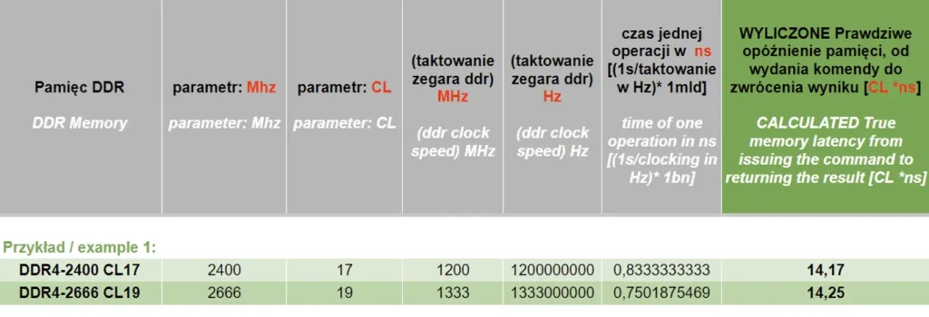 Jeśli chciałbyś porównać wydajności przykładowe wydajności modułów pamięci RAM skorzystaj z linków na końcu tego wpisu, które zaprowadzą Cię do – formularza oraz skoroszytu z wyliczonymi „faktycznymi” opóźnieniami pamięci, od wydania komendy do zwrócenia wyniku – kolumna M w skoroszycie)